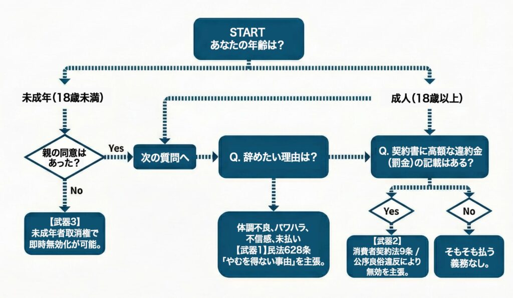 未成年者取消権(民法第5条)を行使すれば、その契約は「最初からなかったこと」にできます。違約金も、契約期間も、すべて無効です。「親の同意書を偽造した」などの詐術を用いていない限り、この権利は最強のカードとなります。