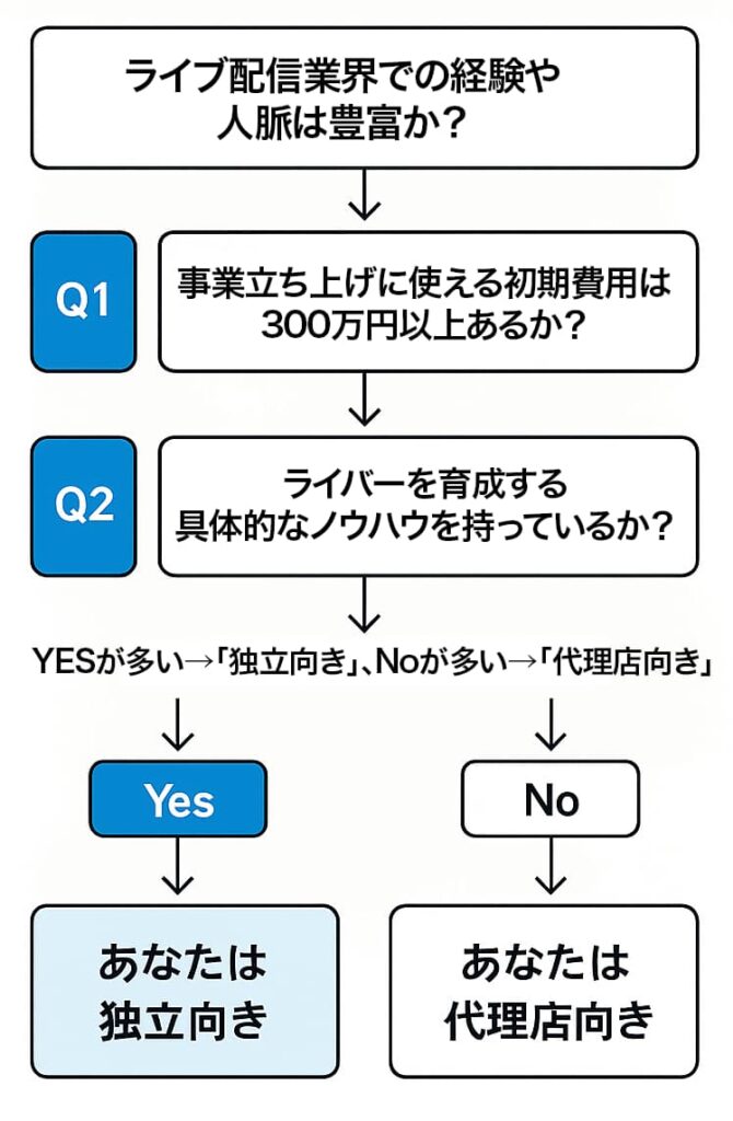ライバー事務所を始めるにあたり、あなたは2つの道から選ぶことになります。「ゼロからすべてを自分で作り上げる完全独立」か、あるいは「既存の事務所の看板とノウハウを活用する代理店加盟」か。ペルソナである田中さんのように、副業から始めたい、リスクを抑えたいと考える方にとっては、特に重要な選択です。