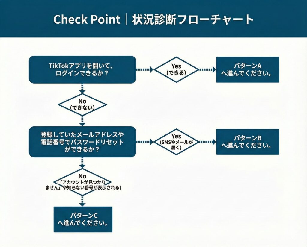 今、あなたの手は震えているかもしれません。画面を見るのも怖いかもしれません。しかし、ここでの初動が、アカウントを取り戻せるかどうかの9割を決めます。まずは深呼吸をして、現在の状況を冷静に確認しましょう。乗っ取りの被害状況は、大きく分けて3つのパターンに分類されます。自分がどのパターンに当てはまるかを見極めることで、無駄な操作を省き、最短ルートで解決へ向かうことができます。