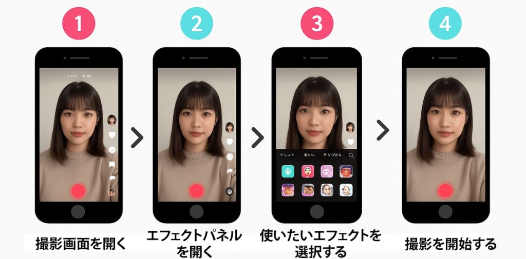 最もオーソドックスな方法です。撮影画面の左下にある「エフェクト」アイコンをタップすると、エフェクトパネルが開きます。「人気上昇中」「ビューティー」「おもしろ」などのタブを切り替えながら、直感的に探せます。