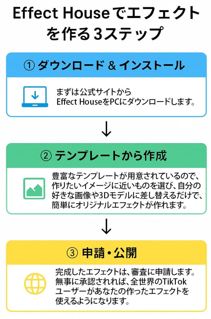 3. 申請と公開: 完成したエフェクトは、審査に申請します。無事に承認されれば、全世界のTikTokユーザーがあなたの作ったエフェクトを使えるようになります。