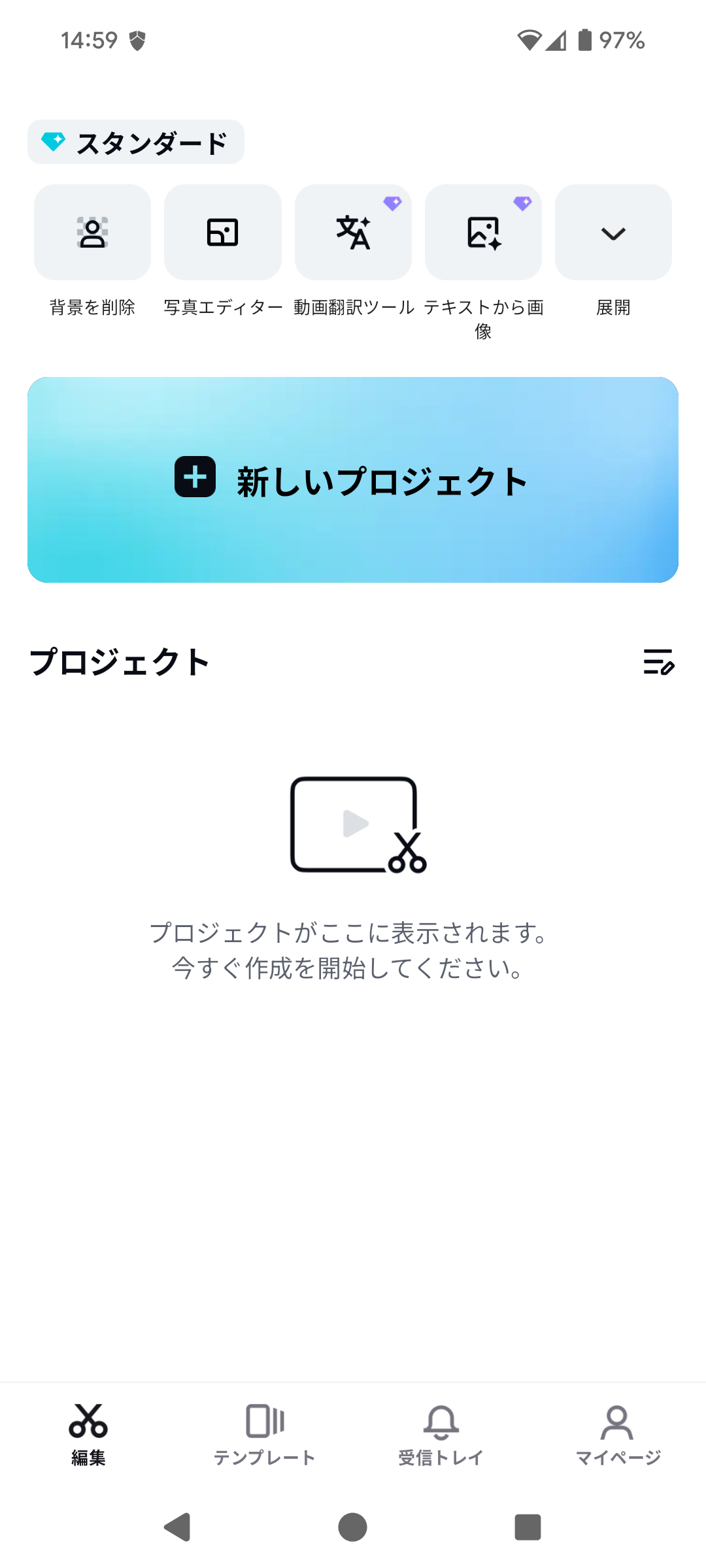 アプリを開くと表示される「新しいプロジェクト」という青いボタンをタップします。ここから編集がスタートです。