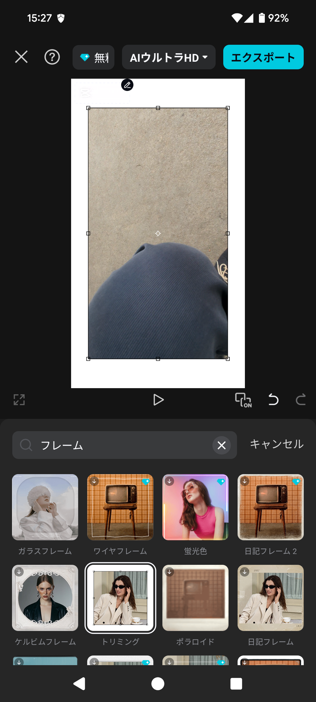 すると、様々なデザインの枠(フレーム)が一覧で表示されます。インスタントカメラ風、映画のフィルム風、キラキラしたものなど、たくさんの種類があります。