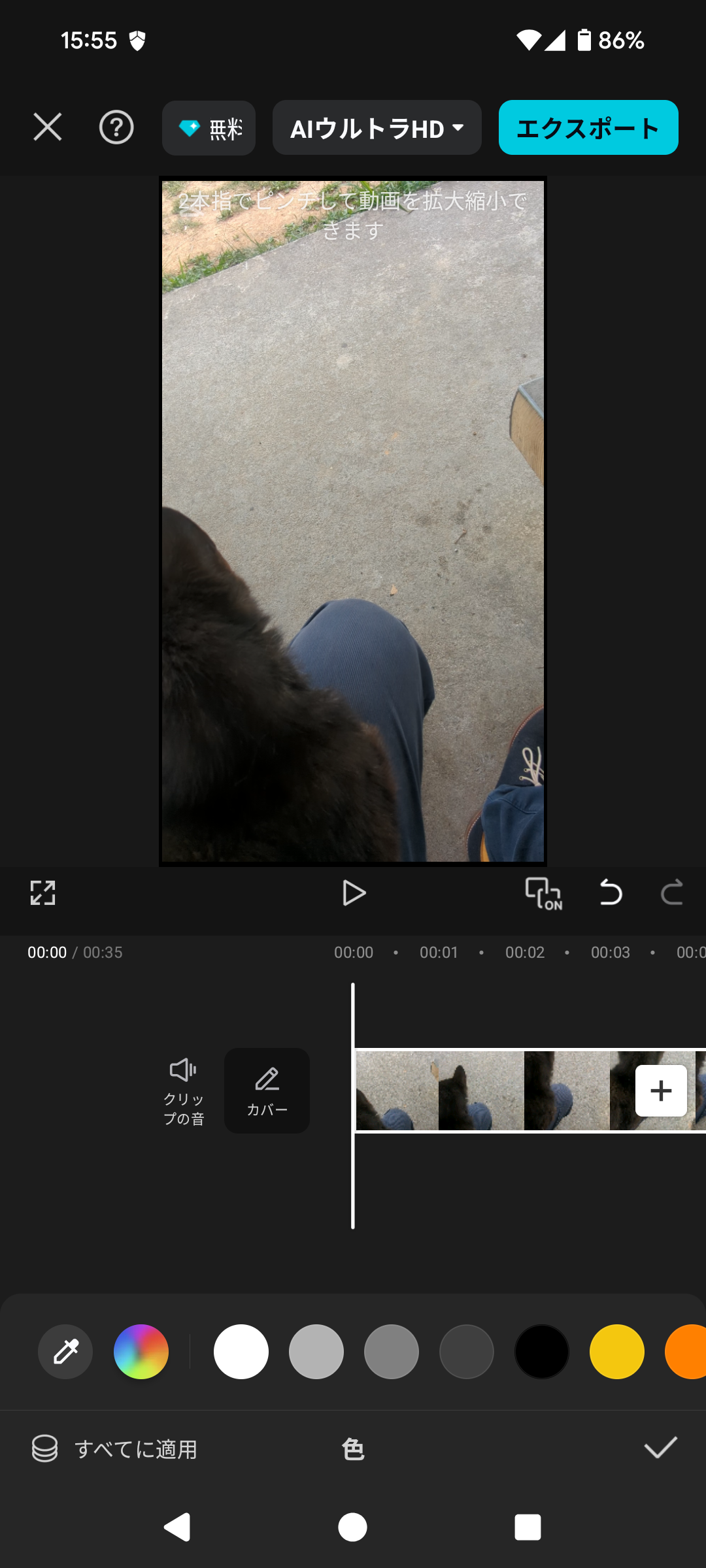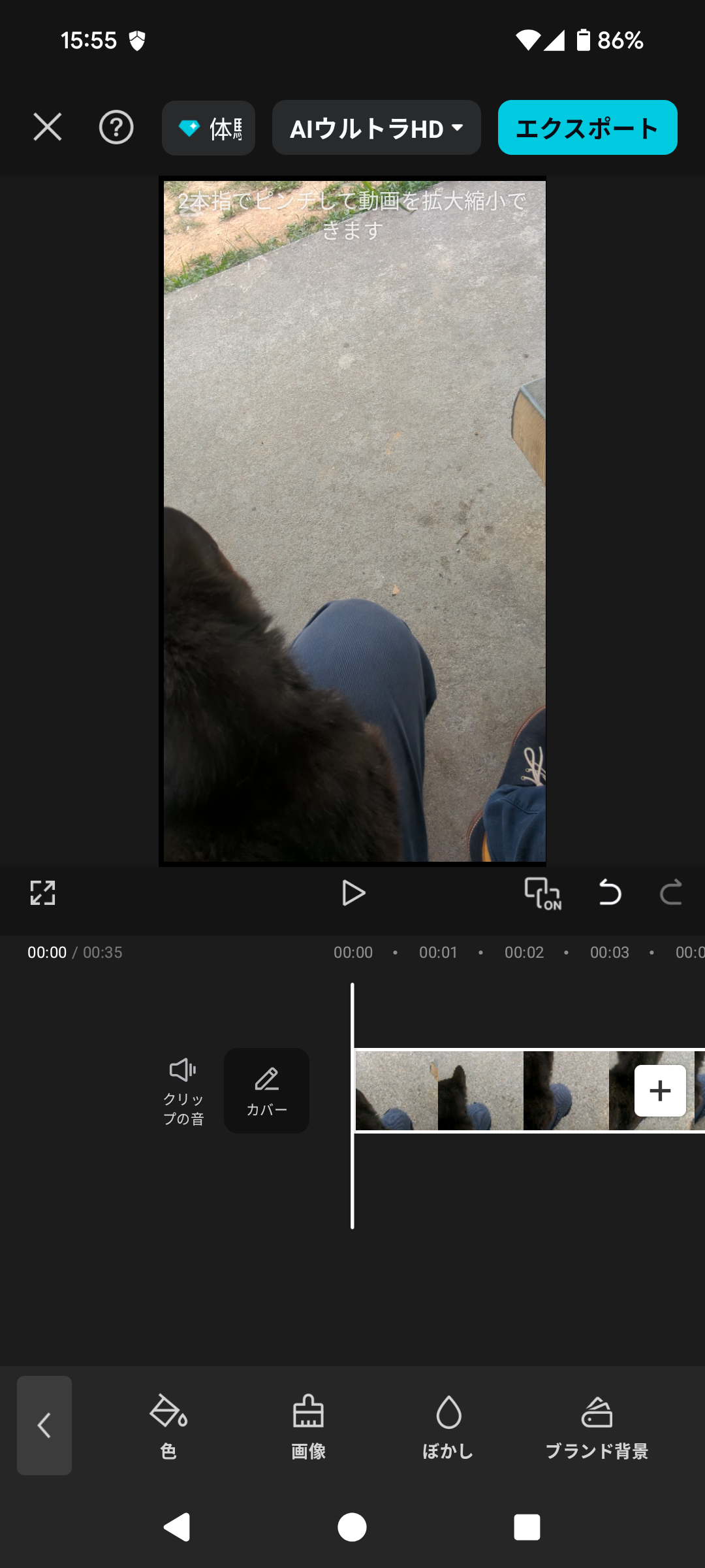画像を2本の指で触って、ピンチイン・ピンチアウト(指を閉じたり開いたり)することで、サイズを自由に拡大・縮小できます。動画にぴったり合うように、大きさや位置を調整してください。