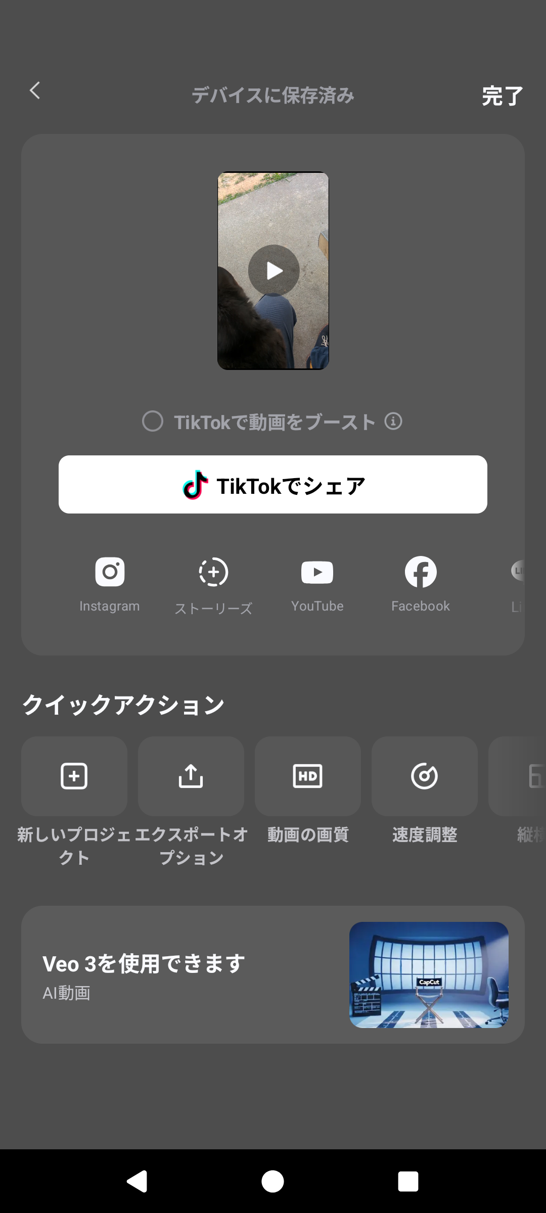 編集が完了したら、CapCutの画面右上にある「上向き矢印↑」のボタンをタップします。これがエクスポート(書き出し)ボタンです。解像度を選べますが、通常は1080pのままでOKです。書き出しが完了すると、「TikTokに共有」というボタンが表示されます。これをタップすれば、自動でTikTokアプリが起動し、今作った動画をすぐに投稿できます。もちろん、「完了」を押して一旦スマホに保存してから、好きなタイミングで投稿することも可能です。